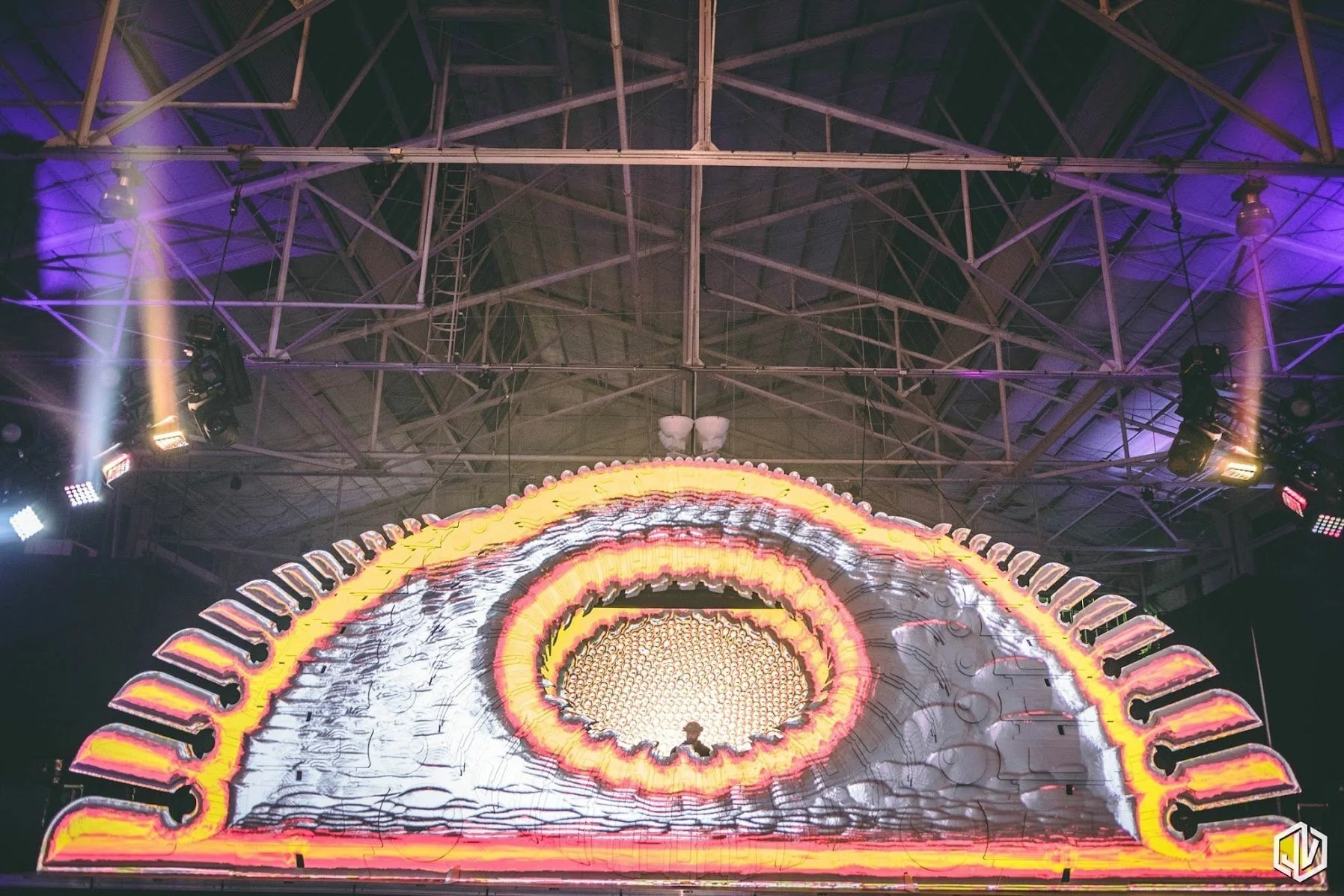 An unforgettable NYE Event in a beautiful venue on the Bay in Richmond California. Coalesce brought together some of the worlds absolute best talent both for Music and Visual Arts. The Weekend orbited around a beautiful stage designed by Carey Thompson. Lighting designed by Jason Magellan lit the rest of the space the way for roaming performers from Pyroglyphics and MASC Studio to entertain people in every nook of the beautiful building. To balance out the energy emitting from the stage a massive Bronze Mars 1 Molecule sat opposite of the stage near the back grounding the experience between these two focal points. Some of the brightest talent in painting today lined the walls and led the experience to the dance floor where patrons were invited to bath in finely tuned Funktion one audio with none other than Ron Lorman at the helm and the amazing folks at One-Source Productions. There, people could gaze up at the incredible world class visuals displayed on the 42 foot stage piece.