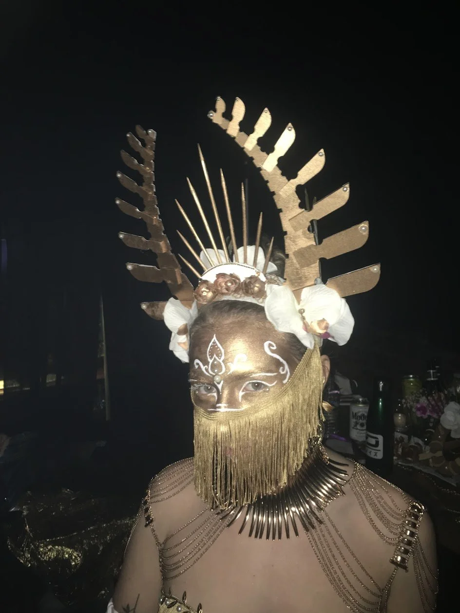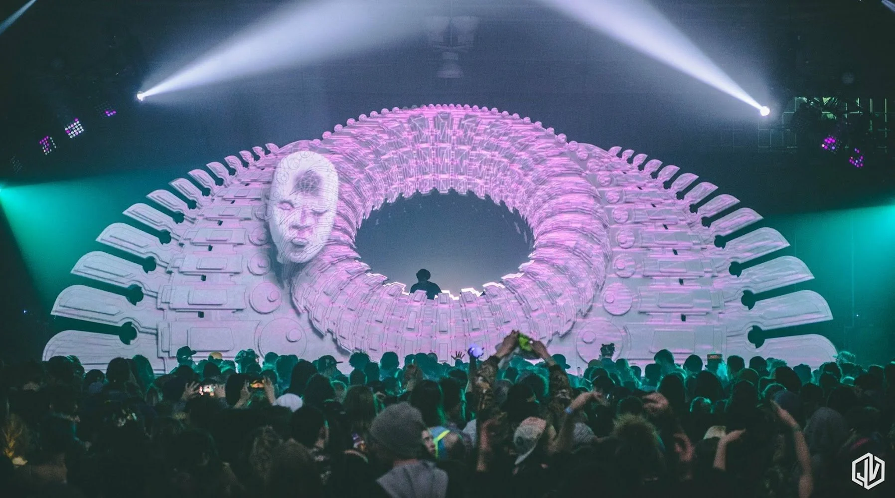 As Production Designer I collaborated with the event Producers at Cosmic Synergy to curate the lineup pairings and scheduling, worked with the lighting crew to assure the best possible looks for the event, developed the 3D models, mapping templates, and final signal flows for the visual art team to start creating content for the event. I took on the job with one month before the event and had finalized assets to the animators and VJs quickly after. Martin from DoubleYou also provided a lot of help getting the models finalized for all platforms as well as lent free use of his render farms for us to use. I also worked with the fire performers, aerialists, and roaming performers to help schedule the best times for their acts, and also worked with some of them to develop custom costuming for their headdresses using the same design as the Carey Thompson Stage. An NYE countdown was curated by me using art from the facebook community “tipper art” using art from community members some of whom would be in attendance.